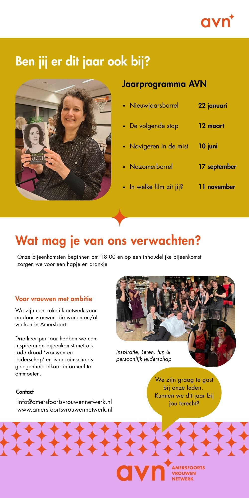 We richten ons op vrouwen in een managementfunctie in brede zin van het woord. We streven naar een ledenaantal van 35 vrouwen, zodat we elkaar kennen. Werken of wonen in de omgeving van Amersfoort is wenselijk, omdat onze afspraken daar plaatsvinden. De thema bijeenkomsten hebben drie maal per jaar een inhoudelijk programma. Een fantastiche spreker of een workshop voor en door leden. Daarnaast organiseren we twee keer per jaar een gezellige borrel.